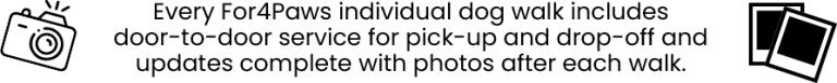 Every For4Paws individual dog walk includes door-to-door service for pick-up and drop-off and updates complete with photos after each walk.